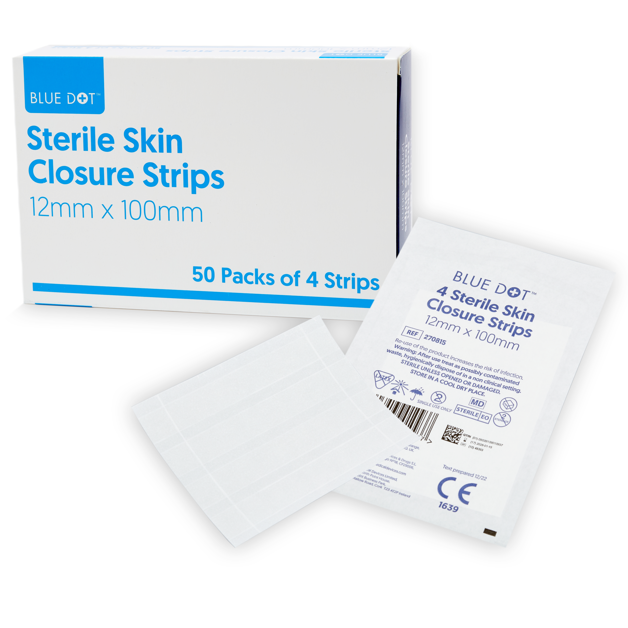 Blue Dot Skin Closure Strips are used in the emergency treatment of a range of wounds to reduce bleeding and encourage the wound to heal effectively. Blue Dot Sterile Skin Closure Strips are an economical, convenient solution for wound closure and are an effective alternative to asuture or staples.